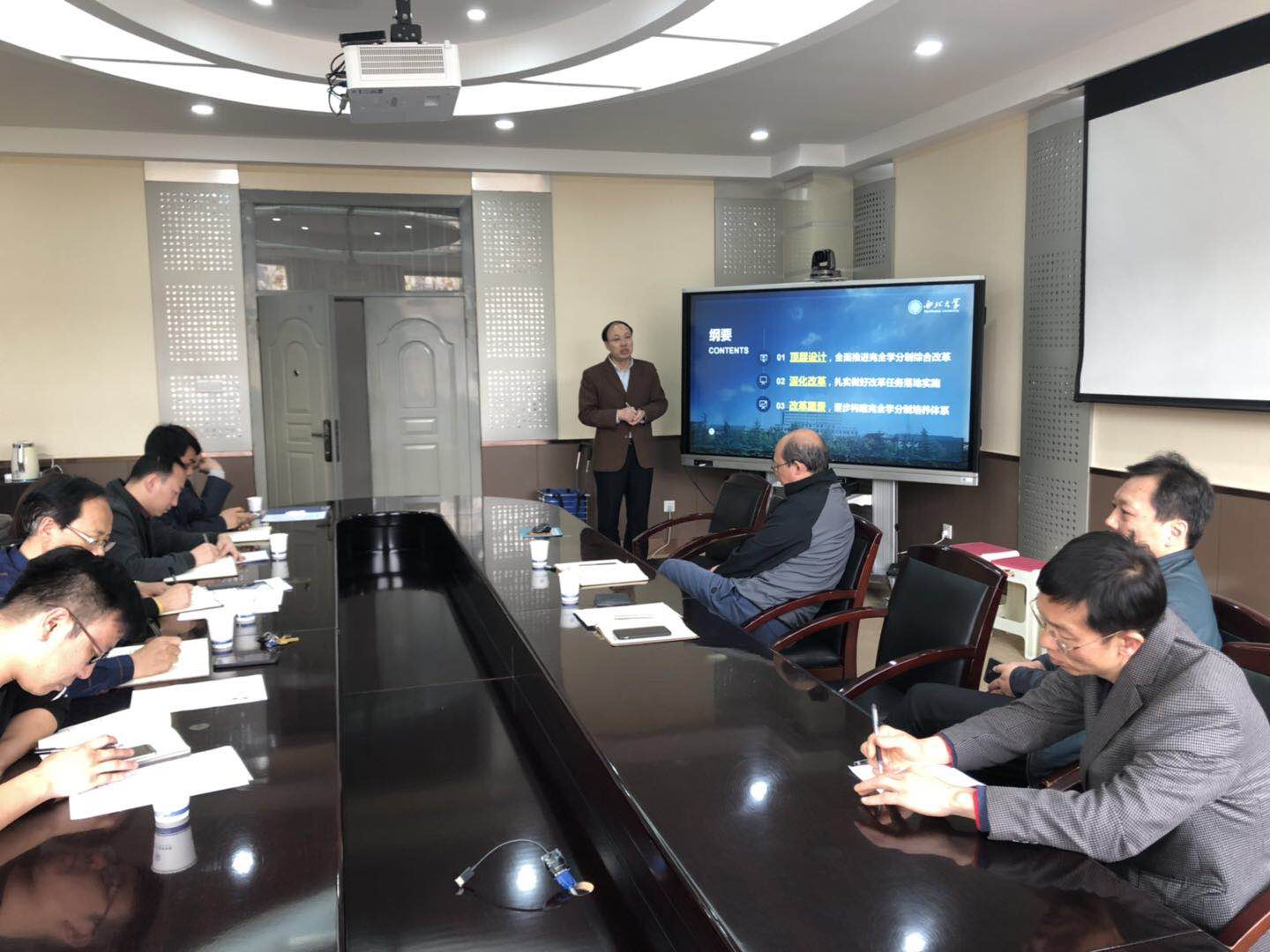 顶层设计,全面推进完全学分制综合改革。他首先指出,本科教育始终处于学校改革发展的主体地位,全面推进西大特色完全学分制改革,着力构建一流人才培养新体系,主要是为了贯彻落实好教育部召开的“新时代全国高等学校本科教育工作会议”精神和我校召开的“以本为本